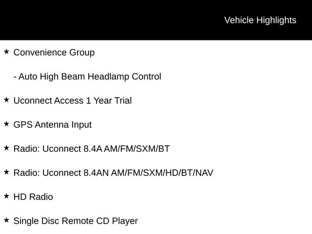 - 10 Speakers, 5-Year SiriusXM Travel Link Service, HD Radio, Media Hub (SD, USB, AUX), Radio: Uconnect 8.4AN AM/FM/SXM/HD/BT/NAV, Single Disc Remote CD Player, SIRIUSXM Satellite Radio, SiriusXM Travel Link, Uconnect Access 1 Year Trial