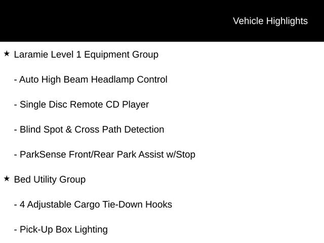 - Laramie Level 1 Equipment Group: Includes Remote Tailgate Release, Auto High Beam Headlamp Control, Blind Spot & Cross Path Detection, Rain Sensitive Windshield Wipers, ParkSense Front/Rear Park Assist with Stop, and more